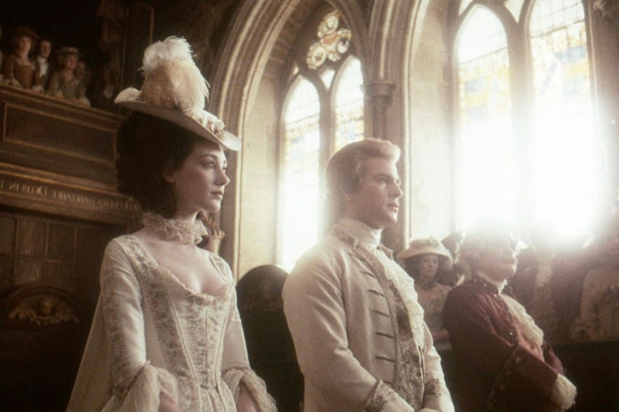 The real subject of the film is something like the sweep of time — yet also the wars and debaucheries and absolute ossification of the European aristocracy, so many infantilized mummies in powdered faces, always disdainful and bored. Barry’s world is one of ritualized violence at the mass civilizational level, and we’re with him as he schemes his way into the class that benefits most from it. But in the end he’s as pathetic as anyone, cruel to his wife and abusive of his stepson, redeemed only by his total love for his little boy, Bryan. When the child dies, we finally see Barry the human being, for a moment, crying over the boy’s bed. It’s an anachronistic Victorian commonplace on Thackeray’s part — the sentimental death of the sickly child. Yet Kubrick leans so far into the maudlin scene that it revolves right past the film’s general irony until it comes back around to sentiment again. The death scene is fascinating, a real test case for the film as a whole: somehow the Kubrickian distance becomes the perfect medium for a 19th-century author’s vision of an 18th-century rogue.