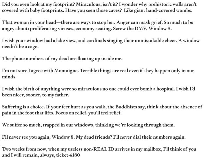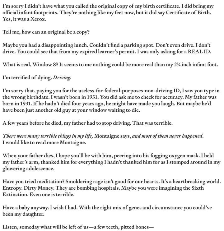To the Woman in Window 8 at the DMV Clams Donna Masini’s new book, Did You Find Everything You Were Looking For? (W.W. Norton and Co.) will be out in Spring 2026. Her other books include 4:30 Movie, Turning to Fiction, That Kind of Danger, and About Yvonne, a novel. Her poems have appeared, or are forthcoming in The New Yorker, Best American Poetry, American Poetry Review, Paris Review, Poetry, et al. She lives in NYC and teaches at Hunter College.